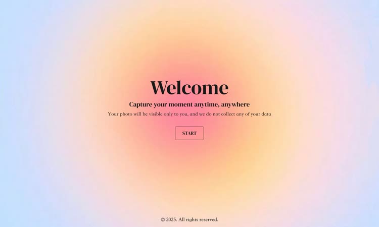 PhotoBooth CS is a privacy-first photo capture web app. ## Features - **Privacy First**: Photos are visible only to you - no data collection whatsoever - **Instant Capture**: Take photos anytime, anywhere directly in your browser - **No Sign-up**: Start capturing immediately without creating an account - **Clean & Minimal**: Elegant serif typography with dreamy gradient background ## Use Cases - Quick personal photo capture - Privacy-conscious photo moments - Simple headshot or portrait photos - Instant photo booth experience without sharing data