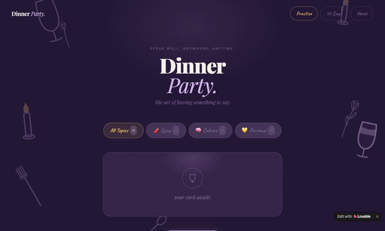Dinner Party is a conversation practice tool that helps users improve their speaking skills through prompt cards. Draw cards from categories like Small Talk, Deep, Funny, and Career to practice conversation starters in a low-pressure, game-like format. Perfect for anyone wanting to become a better conversationalist.