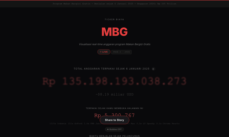 BiayaMBG adalah alat visualisasi anggaran secara real-time yang menampilkan pengeluaran publik Indonesia untuk program Makan Bergizi Gratis (MBG) sejak 6 Januari 2025. Halaman ini diperbarui setiap detik, menyajikan anggaran triliunan rupiah dengan cara yang mudah dipahami oleh masyarakat umum — dikonversi ke dalam referensi yang familiar seperti mi instan Indomie, pesanan GoFood, UMR Jakarta, iPhone, tas Louis Vuitton, dan lain-lain. Informatif sekaligus menghibur.