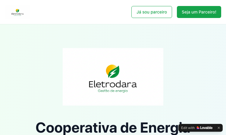 Eletrodara is a solar energy cooperative platform operating across Brazil, enabling partners to help residential and commercial consumers access affordable solar energy without installing panels on their properties. Features: Energy Cooperative Model where multiple consumers share energy generated by a single solar plant; up to 90% bill reduction; partner program with commissions; no initial investment required; full training and support; mobile-first platform. 1247+ active partners across Brazil, R$11,500 average partner monthly income, 95% satisfaction rate.