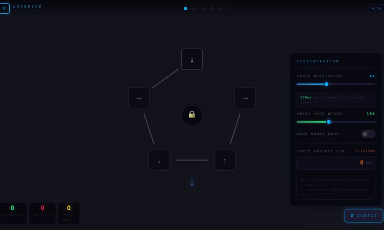 Practice picking locks in a realistic virtual environment with adjustable speed, sweet spot width, and input latency simulation. Perfect for: