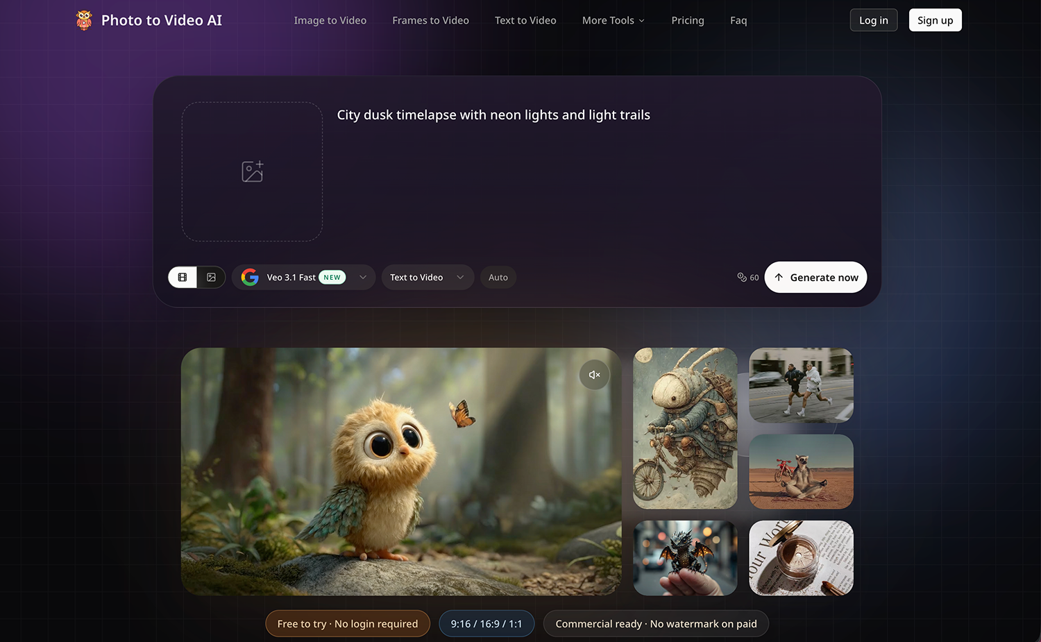Key features include subject consistency (no face morphing or distortion), physics-based motion (realistic hair, fabric, water movement), and multi-format output (9:16, 16:9, 1:1 in 720p/1080p). The tool is free to try with 10 credits — no signup required. Paid plans start at $15.90/month and include watermark-free output with full commercial rights.