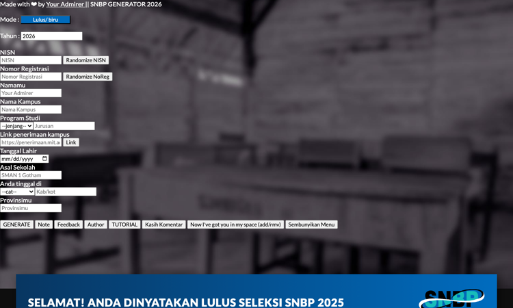 SNBP Generator 2026 adalah tool iseng-generator hasil kelulusan SNBP secara fun/humor. Masukkan nama, NISN, universitas tujuan, dan generate sertifikat kelulusan palsu untuk bercanda. Cantumkan disclaimer jelas: SNMPTN For Fun Only — ini bukan tool resmi dan tidak ada hubungannya dengan penerimaan jalur SNBP yang sebenarnya.